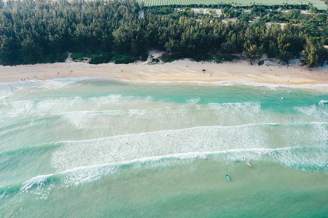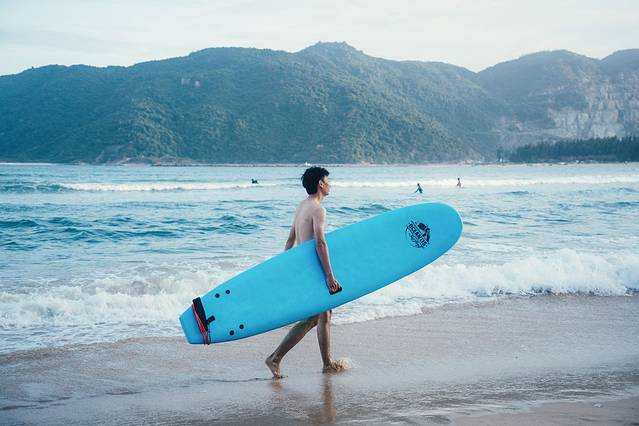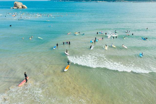 随着冲浪文化东渡,十年前,第一批浪人来到后海村——冲浪这项运动就是要不停地追浪、寻找好浪点——后海湾(也称皇后湾)的细软沙滩与水浅浪柔对他们而言可谓是个好浪点,对于冲浪初学者更是得天独厚的练习场。