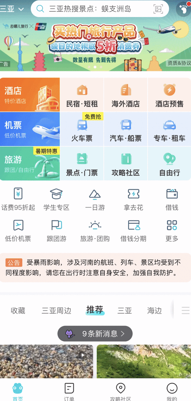 这一次的省钱攻略,是打开去哪儿网app,点击旅游频道,选择暑期嗨玩季,在里面就有超多的优惠!