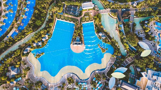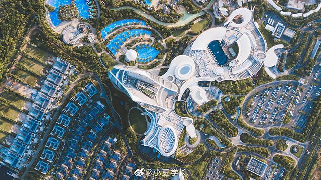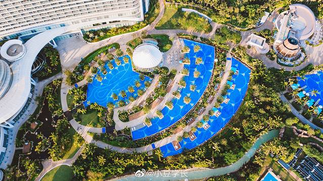从空中看酒店,核心的区域就是一个联动的游泳池,这也是我最爱的一个区域,每天都会花点时间在游泳池泡着,很是惬意, 三亚的空气质量很透彻,从空中拍清晰度依旧很高。