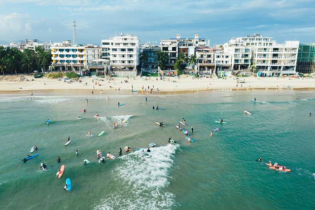 但后期后海村的出圈很大一部分原因要归咎于村落北侧一片藏于海棠湾一角的半圆形海湾,因其弧度巧妙,全年都有海浪全方位、多角度推向岸边,天然为冲浪创造了条件。当然,冲浪文化在国内发迹前,这样的优势很难被人发觉,海上漂着的大多还是当地村民打渔的渔船。