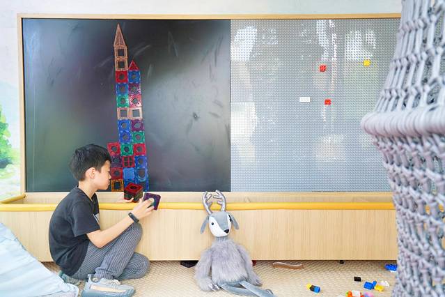 这次和朋友们带着家里的小朋友一起入住的亲子别墅,是独栋别墅,门口就有两个停车位,私人别墅的既视感~接近200平方的空间,有三个卧室,一个客厅,一个玩乐区,还有一个可以看投影和观星的阁楼,室外还有一个小小的露天就座的区域。每一个房间都有独立的洗手台和卫浴间,适合三个家庭组团来一起分享这么一栋别墅。适合小孩子喜欢的游乐场被搬进了这栋别墅,好玩的旋转滑梯和3层高弹力的攀爬网,足够让我外甥玩上大半天了。玩乐区还有乐高玩具墙,魔力磁铁墙和适合幼龄孩子的卡通玩偶,住在这里,就好像拥有了一个24小时不收门票的专属游乐场。