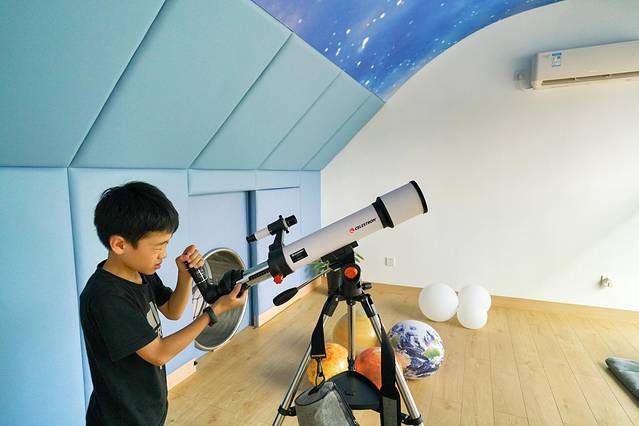别墅的顶楼有个阁楼,上面贴心配备了望远镜和投影幕布,靠着软垫看电影,这样的度假不光是小朋友,连大人也都很喜欢呢!之所以叫探享家亲子别墅,卖点就是在房间内可以观看星星,别墅内最亮眼的特色就是三楼星空阁有有一扇星空顶,用望远镜可以看到纯粹的夜空和闪耀的星星。