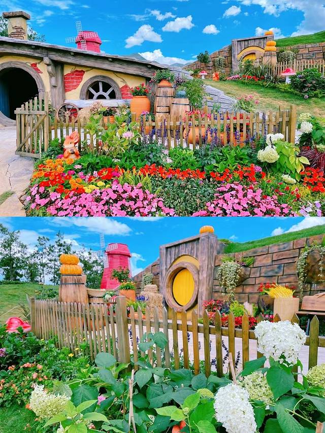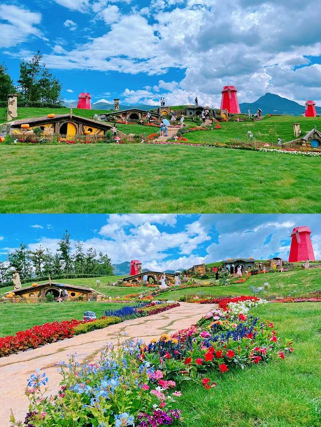 这是什么神仙地方呀?蓝蓝的天空,白白的云朵,阳光灿烂,凉风吹拂,开满了各种各样鲜花的彩色小木屋,犹如走进了天空之城的精灵童话世界里。这是中土世界的霍比特人村落,每一个来到此地的人都不禁欢呼起来,太美了吧!大家脸上都洋溢出开心的笑容,不仅小朋友们目瞪口呆,大人们也像回到了童年,多么美好的地方呀,梦境一般……