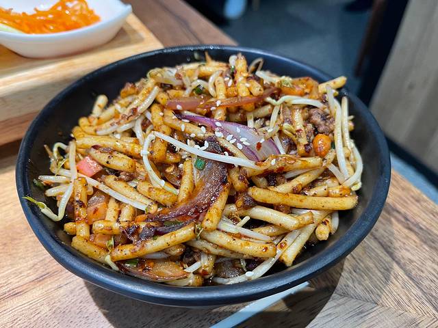 一张面皮将各种切丝的食材像包裹襁褓中的娃娃一样裹起来,舀一勺秘制酸汤,一口咬下去,好吃停不下来。