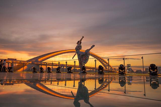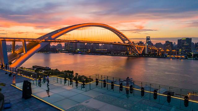 7. 强烈推荐一定要在7楼天台看一场日落,在悬崖露台那里,可以俯瞰卢浦大桥,夕阳西下,粉紫色的晚霞洒满整片天空,映衬在露台的地面上,如天空之境一般。