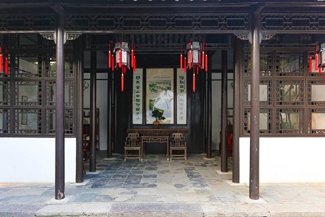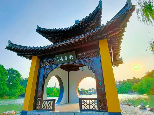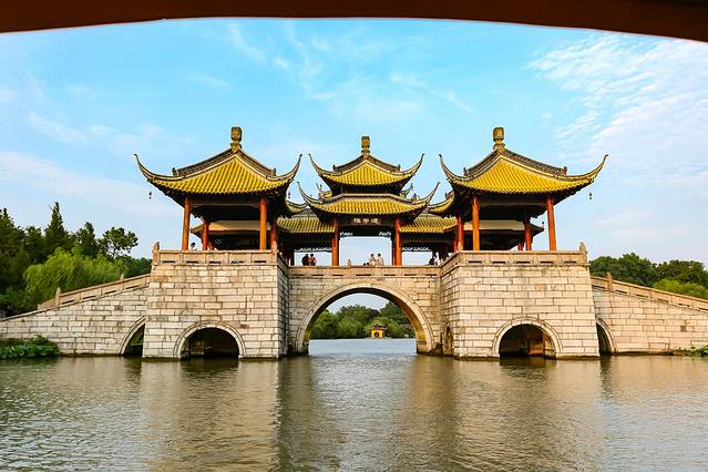 另一处著名的景点便是这钓鱼堂,传说是乾隆帝下江南曾在此垂钓而得名。站在这里还是网红拍照打卡地,因为从亭子的两个圆孔可以分别看到五亭桥和白塔,也造就了一处观三景的奇观。