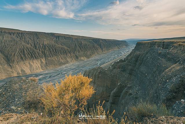 只见一条幽深的峡谷就这样出其不意地呈现在面前,如同瞬间于地下冒出来的一般,这道深达数百米的峡谷南北绵延不见尽头。仅眼前数公里的范围内,两边尽乎直上直下的悬崖峭壁,静静地,如同一排排雕塑一样挺立在奎屯河两岸。