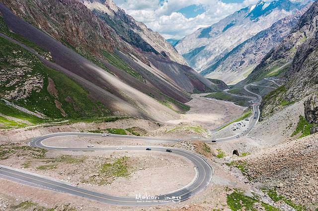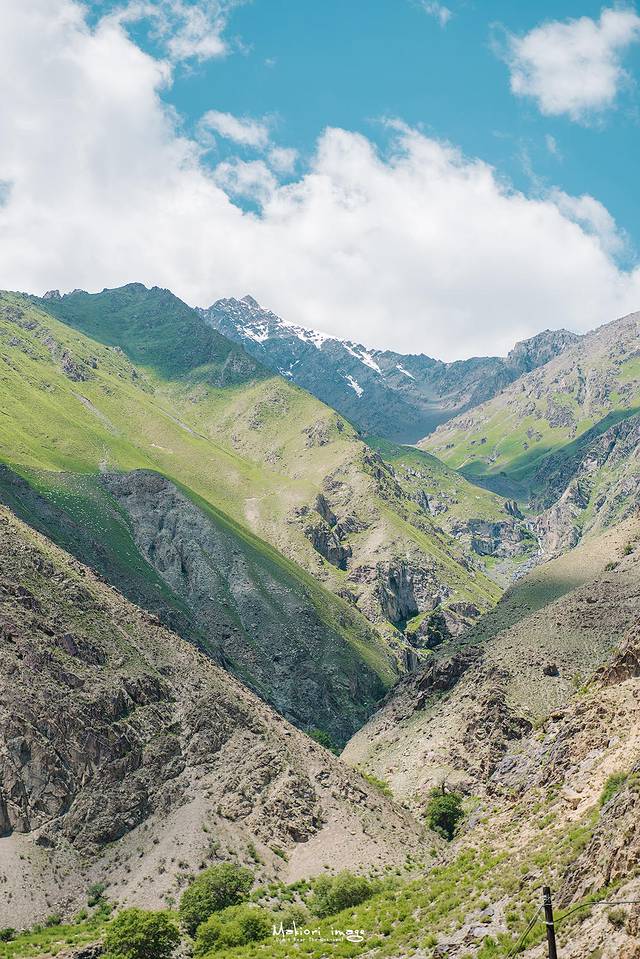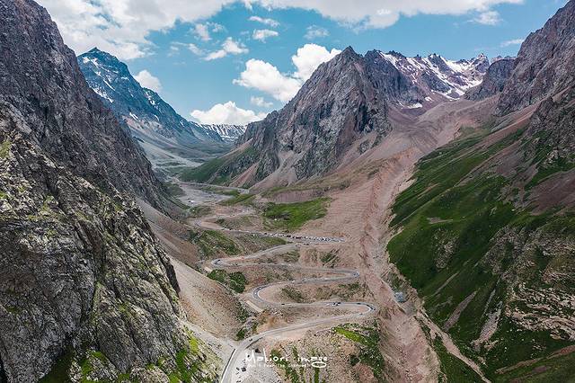伴随着海拔渐渐升高,前方海拔近3400米的哈希勒根达坂是独库公路上的一个重要节点,翻越这里就是独库公路最核心的地段,同时也是最艰险的地带。从这里开始,有人说它如蜀道般处处深沟险壑,也有人说它如天堂般朦胧美丽,在这里你能领略青山碧水,崇山峻岭,深川峡谷甚至是白茫茫的大雪山。