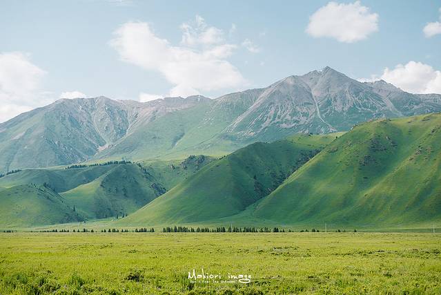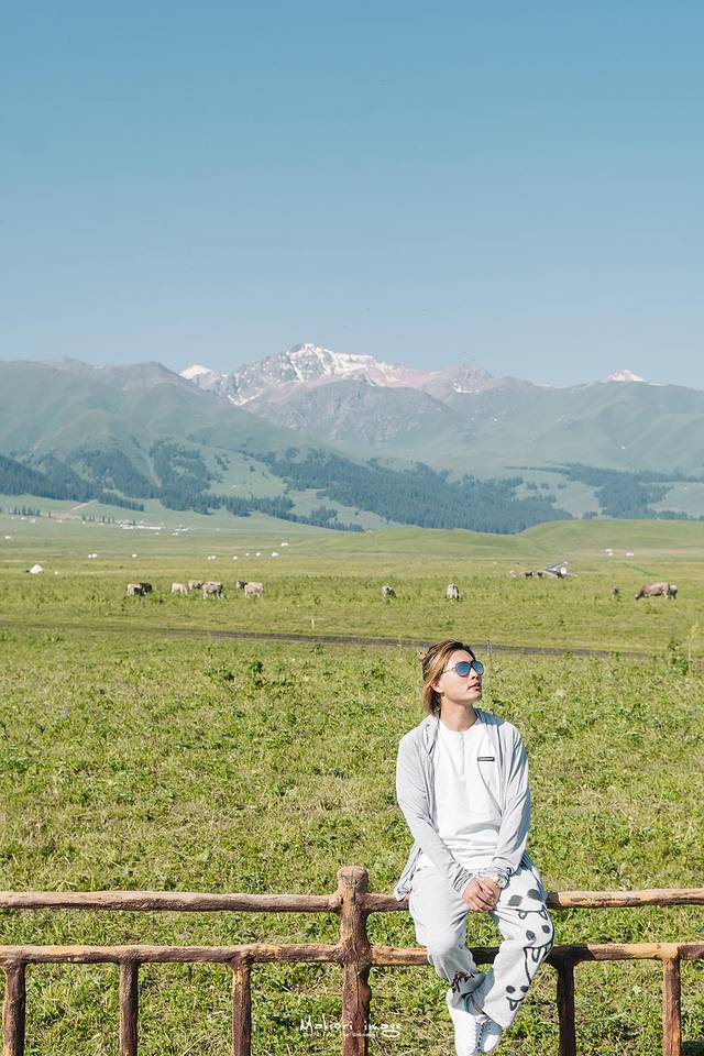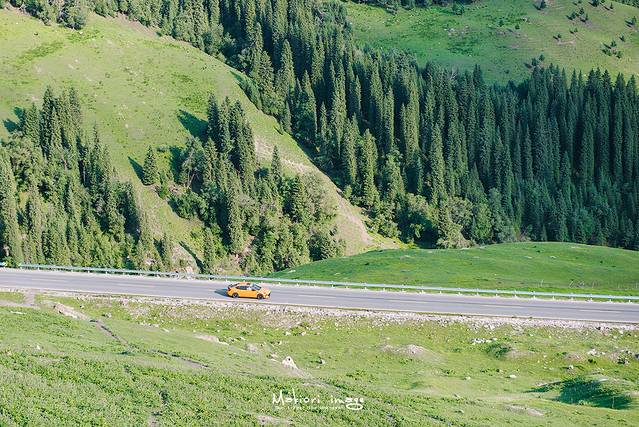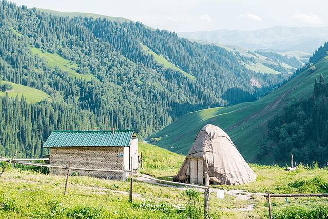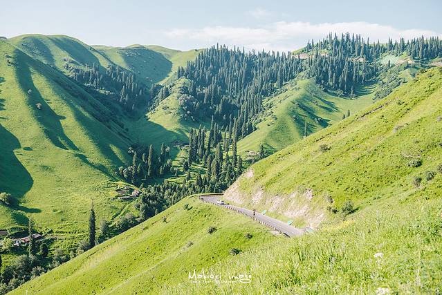 告别老兵我们离开乔尔玛驶向那拉提,一路上以天山雪峰为背景的草原、森林、山川散落于全程,时时刻刻都给人以天然美景的享受。远处的天山遥遥悬挂在天际尽头,起伏宛如波涛,雪岭云杉相互辉映,高山白云相依相伴,山尖不化的积雪与天空中的云朵相接,你甚至分不清哪些是云、哪些是雪。