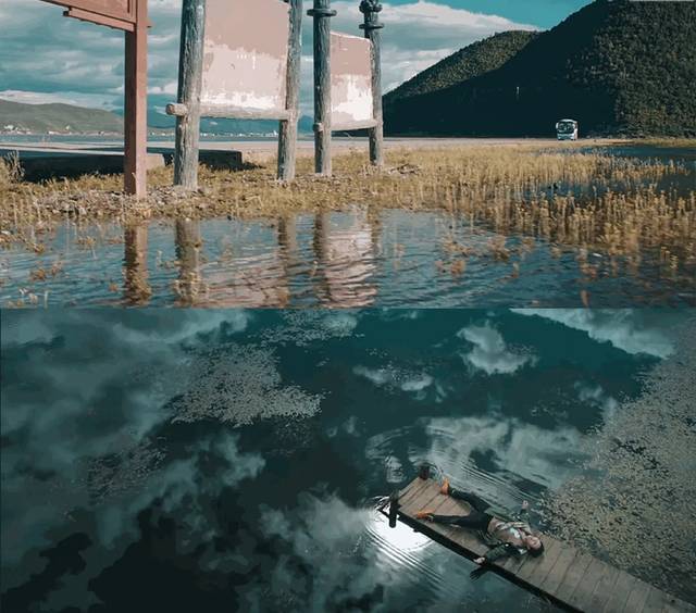 平静的水面,成了天空之镜,水中映下了蓝天白云的倒影,底下的水草,随着山风,左摇右晃着,自然的景观,有着治愈的色彩,天空是那样蓝,似乎一伸手,就够到了天堂,吹过的微风,也令人心神荡漾着。