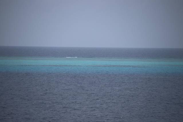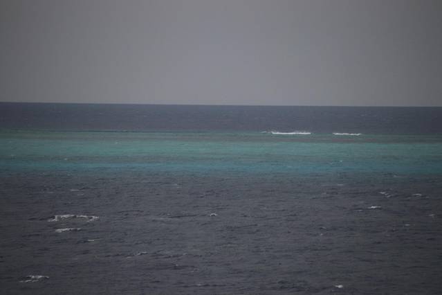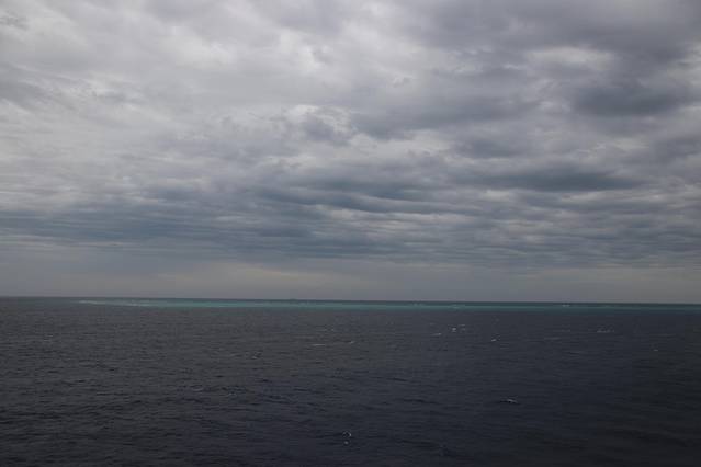 一觉醒来,天上的云彩一点没少,我们的邮轮已经到达了指定锚地。远远望过去,浅蓝色的就是礁盘,我们的锚地海水深度是几百米,而礁盘因为水浅,只有几米,颜色就变得很浅。Tiffany蓝。