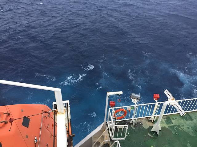 早饭过后,接到通知:不允许登岛,理由依旧是水文条件不允许,浪高太大。已经在船上憋了整整两天的人们就有点崩溃了。交了几千块钱,一共就两天四次登岛机会。昨天没有登岛,要是今天依旧是那个样子,难道我们是交了几千块钱来坐船的吗?虽说船方一直说水文条件不允许,但是我们在甲板上看见给渔民送补给的船来来往往的从我们的母舰上搬运物资下去,已经走了非常多的船。我们心里就不平衡,难道补给船可以走,游览船就不可以吗?事实证明,的确不可以,船长也是从大家的人身安全考虑。一会我就会告诉大家为什么船长一直说水文条件不行。