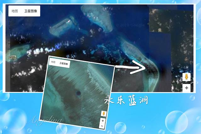 这是西沙群岛的卫星地图,箭头处是著名的永乐蓝洞。据我们领队说,之前几年还可以到永乐蓝洞进行旅游。在锚地划船去。但是现在由于要进行保护和科学考察已经不允许游客去这里了。被保护了起来。