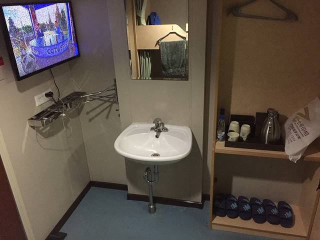 整洁的舱房。我住的是带窗的6人间。由于我出行的时候不算旺季,人不多。我们舱就住了三个人。空了三张床。房间内有洗手台,饮水处,不过得自己去水房打开水喝。在海上淡水是很金贵的,大家千万不要浪费水哦。沙滩鞋,衣架等都是供大家晾泳衣的。