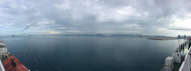 早上起来之后,船已经缓缓行驶在三亚湾了。而且大有雨过天晴的感觉。薄雾在群山上飘荡。
