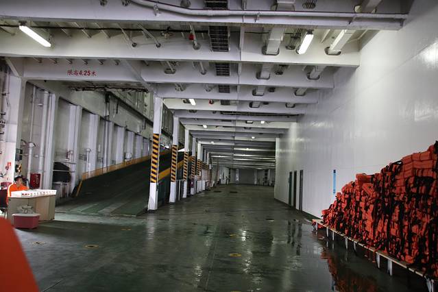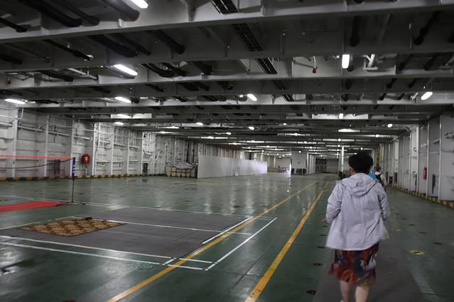 图为南海之梦底仓巨大的仓库部分。还可以看见一个羽毛球球场。我们整齐排成一列向前跑去。