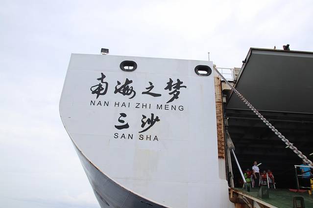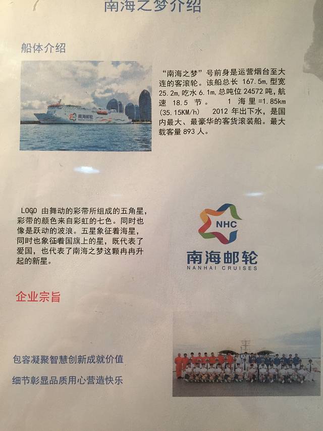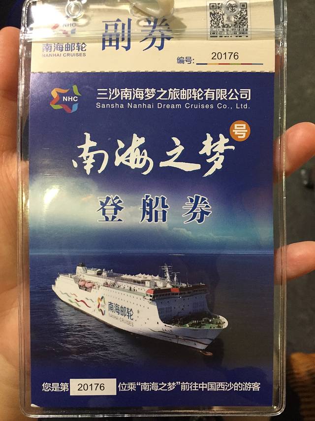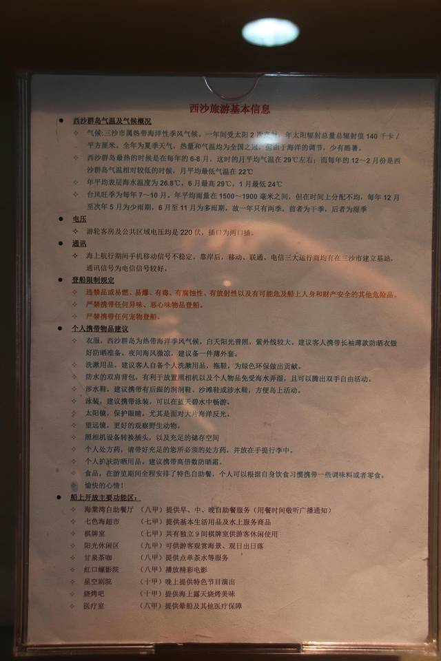 这是南海之梦游轮的简介。南海之梦是滚装船,开始我一直在想一个游轮为什么要做这样的设计。后来问了领队才知道,邮轮旅游的功能只是附属的,邮轮主要的目的是为西沙群岛上的岛民输送给养的。船的下层非常宽敞可以开卡车在里面走。南海之梦定期要给岛民输送淡水,食品和一些生活必需品。赶上台风天,停航多日的情况。岛上的生活是非常艰苦的。