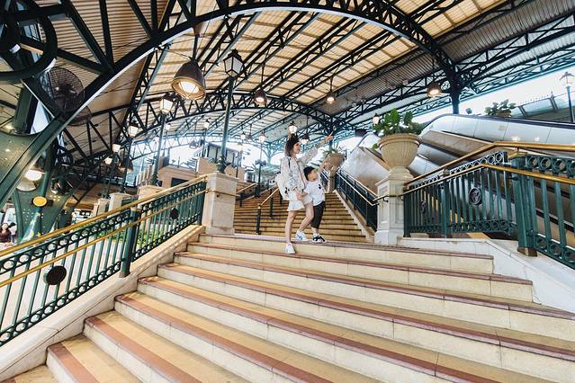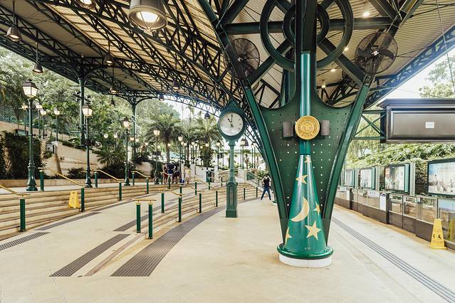 复古的搭建,墨绿色和亮黄色和谐的配色,伴随着列车上具有迪士尼风采的广播声带,“迪士尼站,祝大家有奇妙的一天!:‘’Disneyland Resort Station. Have a magical day!” 从现代化的 香港 瞬间穿越到 香港迪士尼 乐园的奇妙世界!
