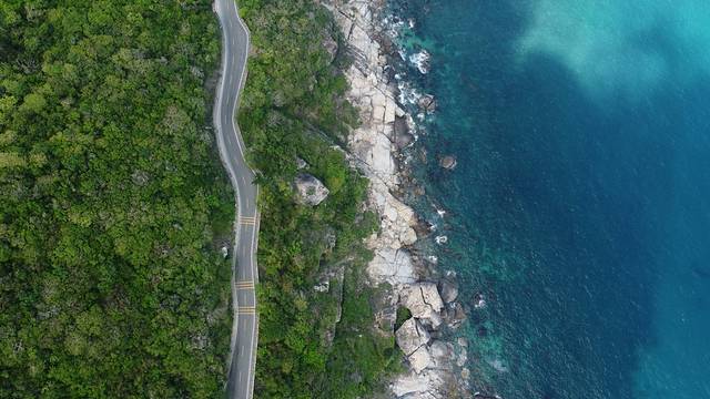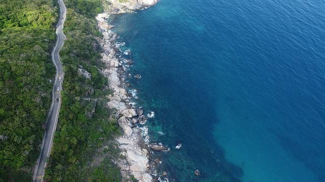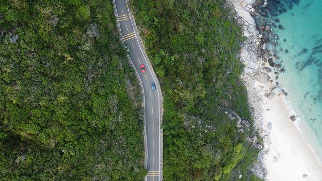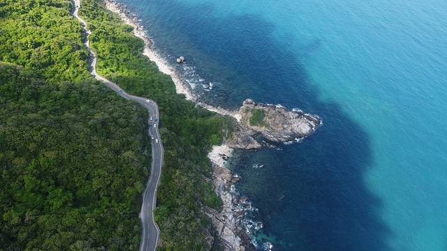 亚龙湾旁边的一个岔口,一条路直走就是前段时间火爆网络的太阳湾,这里也被誉为” 中国 最美海上公路”。一边是绿林山崖,一边是碧海蓝天。