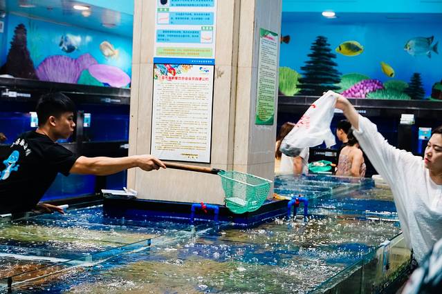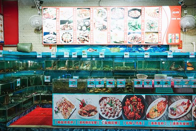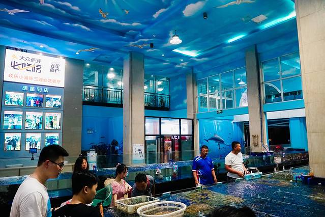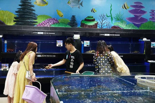 在这里想吃什么海鲜,直接对着海水缸里点就是了。也可以自己直接拿起网子鲜捞现称,价格也很良心,跟外面的海鲜市场里面的价格差不多。