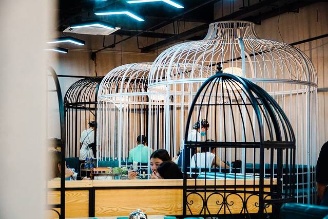 这家在情人桥的店独特的采用了鸟笼的设计,把座位分隔开,又很有意境。