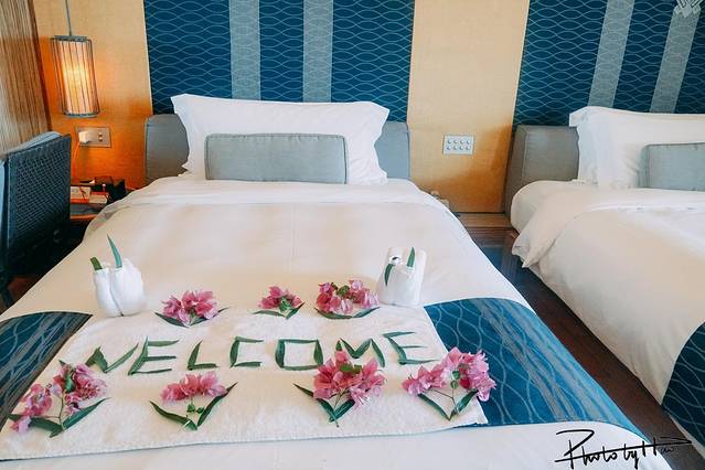 床铺上当酒店离特色的鲜花和绿叶摆放出了Welcome的字样,一笔一划都是精心摆布,比一个简单叠个造型值得开心。