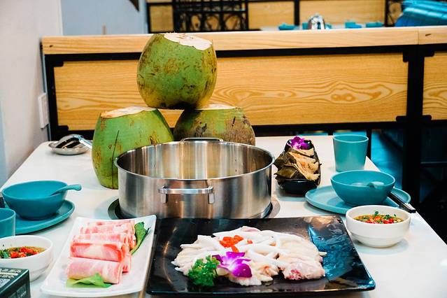 门店里摆了满满的新鲜椰子。每一份锅底都是用新鲜椰子水做成。原汁原味,突出清甜味。