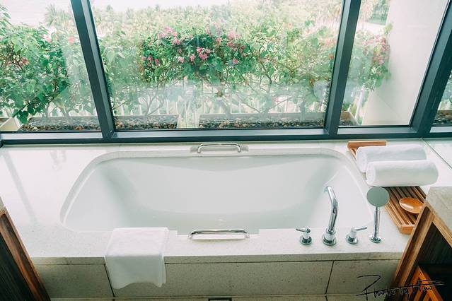 内嵌式的浴缸可以一边欣赏小 东海 的美景一边解压放松。边上落地窗有电动窗帘可以任意调节。