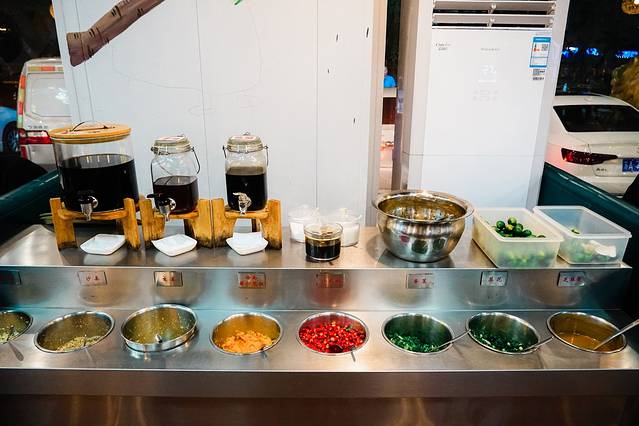 调料台上丰富满满的选择,可以任意搭配。如果不会调的话,可以让店员帮忙调一个蘸料,记得一定要在蘸碟里挤上一两个小青桔,酸酸的很有风味。