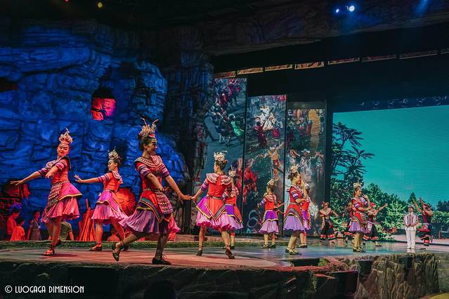 其实很多地方都有这样的演出,比如丽江、武隆、西湖、桂林,但黄水这个是在剧场里面的,虽然不是实景,但是造景和灯光还算用心,一个黄水镇就能做到这样规模的演出,已经很不错。