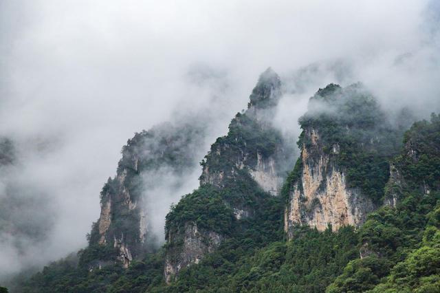 欣赏完终点美景,再坐观光车返回起点,一路都在峡谷内的河道两侧行进,两岸青山巍峨,峡谷夹峙,夏阳河如青龙蜿蜒流长。由于这里地处北纬30度左右,喀斯特地貌明显,沿途山峰秀美奇特,如神如仙、如怪如兽,惟妙惟肖,令人遐想无限,我们恰遇雨后初晴,更可见峡谷间云雾升腾,变化万千,途中的八缎锦、卧佛山、骆驼峰在云雾中若隐右现,巨大的山峰如天神在排兵布阵,又象是在偷窥朝天吼的奇景,让人啧啧称奇,不虚一行。
