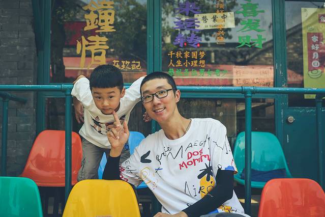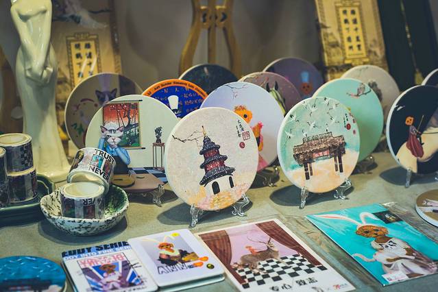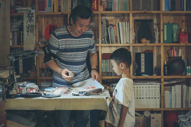 文创小店里的绘画大师,大隐于市,在熙熙攘攘的街道一角,沉浸在自己的艺术世界,娃儿也被满桌子的五颜六色所感染,拿起大师的创造,来个锦上添花吧。