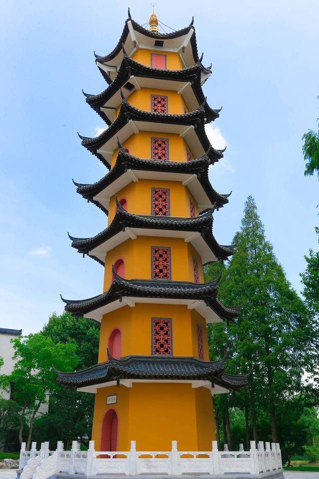银岭塔,七层塔式砖混结构建筑,建于上世纪80年代,集照明,贮水和景观于一体的现代建筑。古式塔型,与古渡千年呼应,与整体园林风格相融。