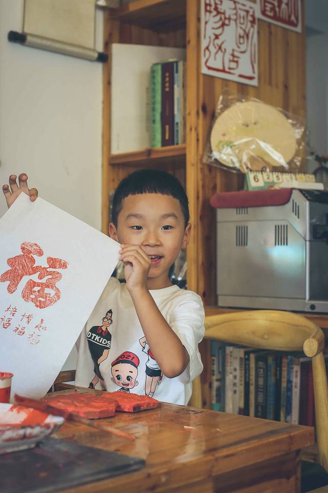 在奕间工坊里,孩子们能亲子动手,染印一幅木板雕刻画,盖上印章,体验古老的艺术在现代世界的魅力。