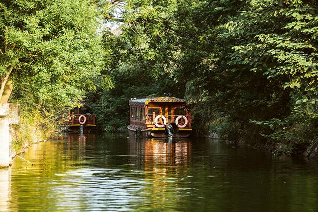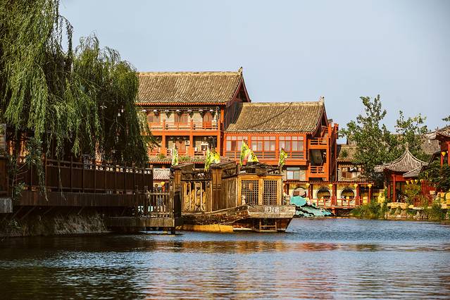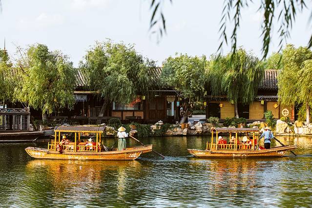 除了酒店接驳的免费船只,园区内也提供游船服务,坐在船上,飘荡在一片青翠绿意之间,观河两岸的风光,我想,这可能是清明上河园最惬意的打开方式了吧。