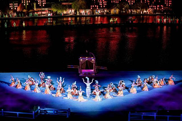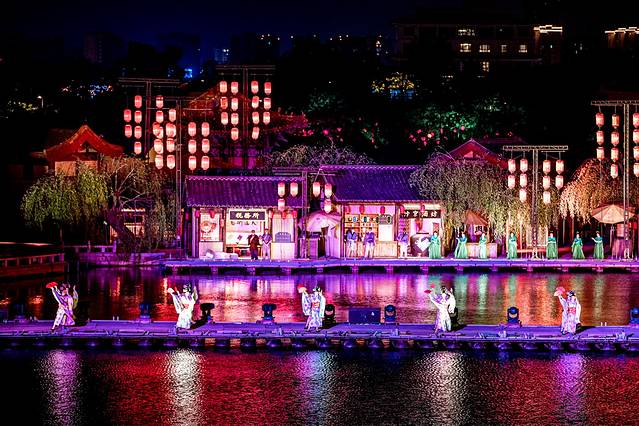 白天还是热闹的勾栏瓦肆,晚上,在灯光的映衬下,那一串串商铺又变成了舞台的真实背景,呈现在我们面前。