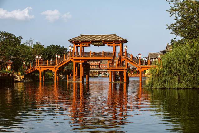 好看的地方,总是与水分不开的。一座座亭台楼阁建造于水系之上,大桥小桥通联彼此,这样的清园,才有了灵性。