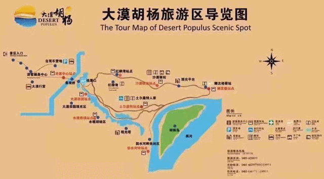 游客服务中心——免费小火车——检票口——步行——如意桥——步行——红柳湾——网红拖拉机——英雄林——骆驼车——沙漠驿站——沙漠冲浪车——胡杨女人之家——观光车——弱水河畔(有竹筏漂流往返)——步行——陶丽淖尔湖(有古装拍摄)——步行——土尔扈特人家(休息,午饭:罐罐菜、西瓜、哈密瓜、各种特色小吃、奶制品、牛肉干、歌舞演艺)——水境胡杨——步行——出口