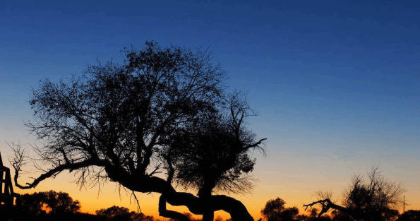 日落时分来到大漠西怪树林,入眼的便是一棵棵兀立荒原,树皮尽褪,树干裸露,惨白的树干,断臂折腰,伤痕累累的胡杨树,那是被刀斧劈过,被雷电击过,被野火烧过。透过这片怪树林,让人不经联想到一种民族的精神,那种“生当作人杰,死亦为鬼雄”的气节,那种“落日照大旗,马鸣风萧萧”的悲壮,那种“黄沙百战穿金甲,不破楼兰终不还”的顽强,还有也让人不能不想到横刀立马的岳飞,封狼居胥的霍去病,“人生自古谁无死,留取丹心照汗青”的文天祥和“我自横刀向天笑,去留肝胆两昆仑”的谭嗣同。