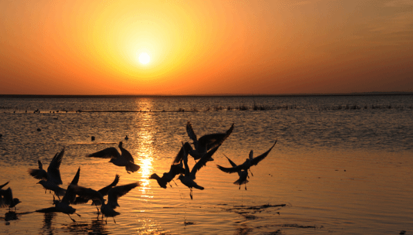 一望无际的湖水在晨曦中碧波荡漾,湖边芦苇丛生,密不透风,芦苇丛里有野鸭和白鹤,天空中海鸥在飞翔,能想象出在茫茫大漠里有这么一片奇幻的景象吗?7.20分,红日从海天相接处缓缓升起,两三分钟,一轮红日就完全跳出水面,挂在空中,整个湖面一片霞光,照亮半湖金色芦苇!