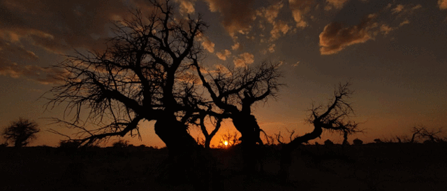 太阳快落山的时候,在夕阳的余晖里,漫步在大漠西怪树林中,看着那些落日下各种姿势枯死的胡杨,苍茫却坚毅,给人心灵的震撼!