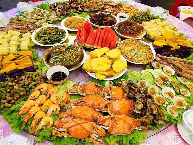 各种新鲜海鲜有螃蟹,皮皮虾,鲍鱼,大虾,鱼,粉丝蒜蓉扇贝,清蒸扇贝,蚬子,麻辣小龙虾等、干贝、海鳇鱼、梭鱼、八带鱼、带鱼、海螺等贝类品种繁多。