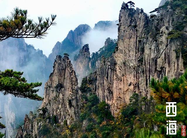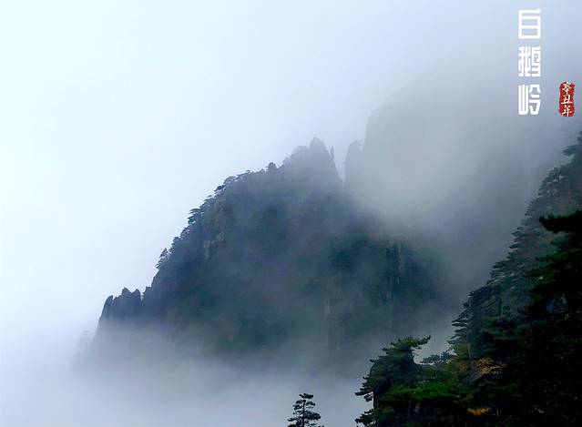 在白鹅岭观景台看到被雨雾笼罩下的黄山奇观