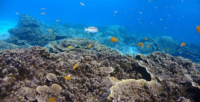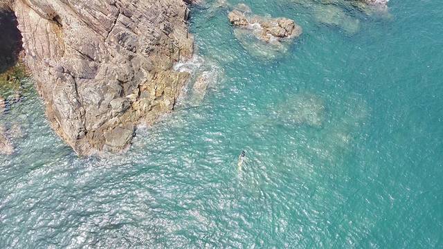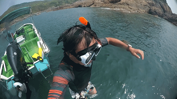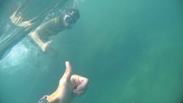 浮潜是戴上简易呼吸管,在水面或较浅水域游玩(自由潜),水性好的人可以憋一口气到水底待上好一会,我试了一口气下到4、5米左右深(图7),水压在我承受范围内,但因为忘记带配重,我需要吐出肺里的气来减轻浮力,但这就缩短了我在水下的憋气时长,我应该待了半分钟左右就受不了上来了;