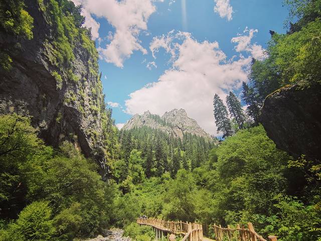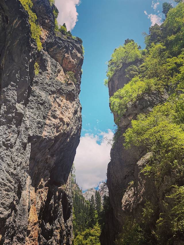 润吾沟一处大山环抱的山沟,里面有小溪、栈道和郁郁葱葱的植被,好几处都有一线天的感觉。小火伴们去玩儿的话走到栈道尽头就好了,不建议继续往里走土路,因为实在不好走,尽头就是一个很小的瀑布,没必要冒险进去!