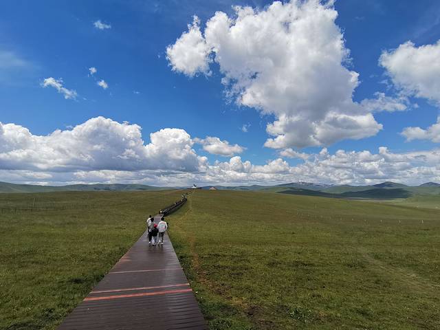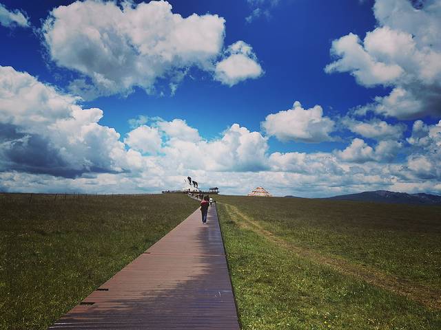 从郭莽湿地的停车场走湿地观景台有一条长长的木栈道,远远的就看到仙鹤雕像和经幡。沿着木栈道一路走去两边充满了绿色生机!再看看来时的公路已经变成一条白色的线延伸到草原的深处。