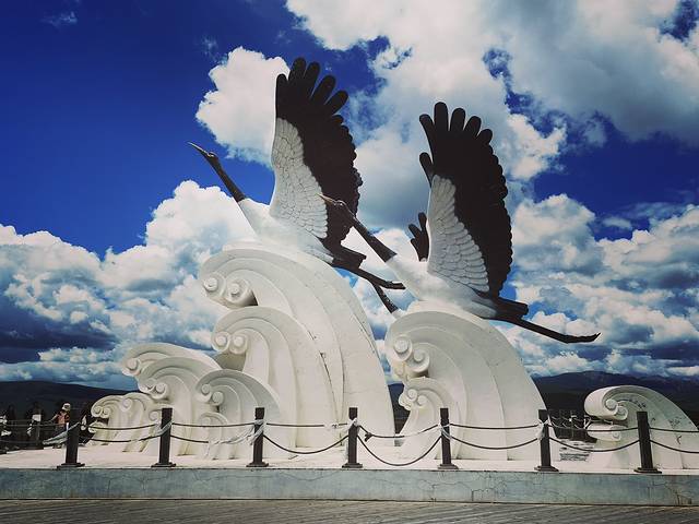 走近观景台,近距离看那座仙鹤雕像,我被这雕像的气势所震撼,三只仙鹤大气磅礴,预飞冲天,背景是蓝天白云相应,这个画面为整个观景台增添了不少仙气。