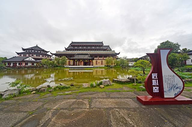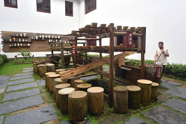 皇窑景区园林建筑古朴雅致,通过实景展示瓷土的加工过程,从矿石到陶泥,每一步都兢兢业业,体现了严谨的工匠精神和丰富经验的积累。