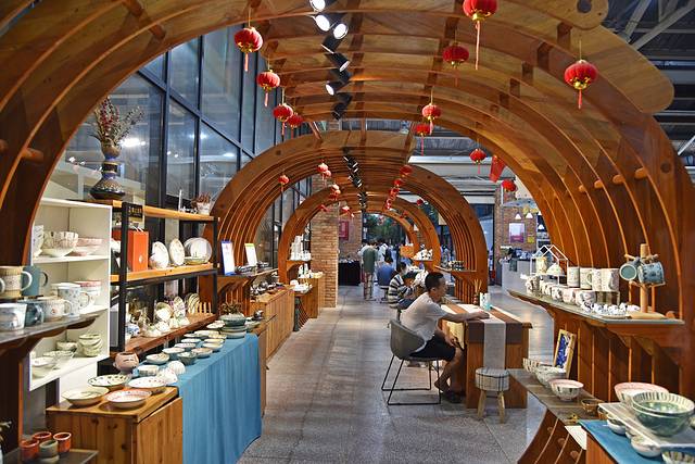 具有年代感的老厂房,如今成了咖啡厅、工作室、餐厅、画廊、精品屋,将古老与现代结合,演绎出糅合的文艺气质,给喜欢艺术创意的人们开辟了一处精神的家园。通过文化植入让工业遗产成功转型,陶溪川成了景德镇的文化新地标、城市新名片。