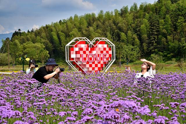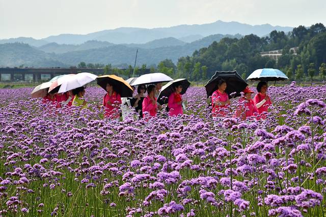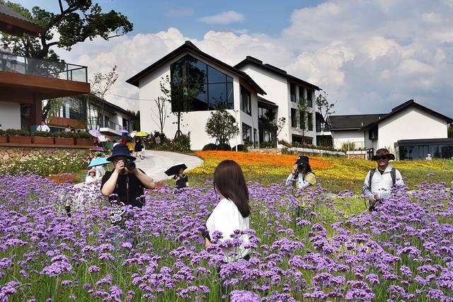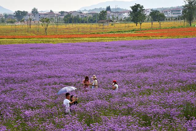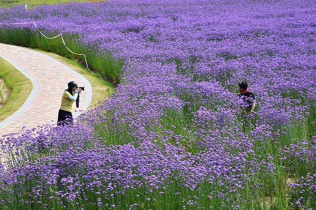 高岭花海由多彩花艺、粉彩花田、颜色釉花谷、青花岭、玲珑花园五个片区组成,种植了几十种不同的花卉,其中紫色的马鞭草成大片规模,是游人最喜欢的拍照取景地。